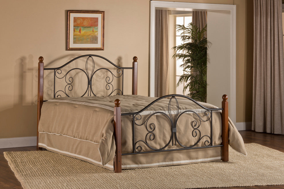 The Milwaukee bed features traditional woodposts that surround a teardrop center wire motif and flowing scrolls. The black textured metal of the grills against the cherry finish of the wood posts make this bed an instant mixed media classic. Bed Set only, rails not included. features traditional woodposts that surround a teardrop center wire motif black textured metal of the grills against the cherry finish of the wood posts flowing scrollsSome Assembly Required Duo Grill - HB: 51"H, FB: 33"H; Post - HB:49.75"H, FB: 32.25"HAssembly Required: Yes