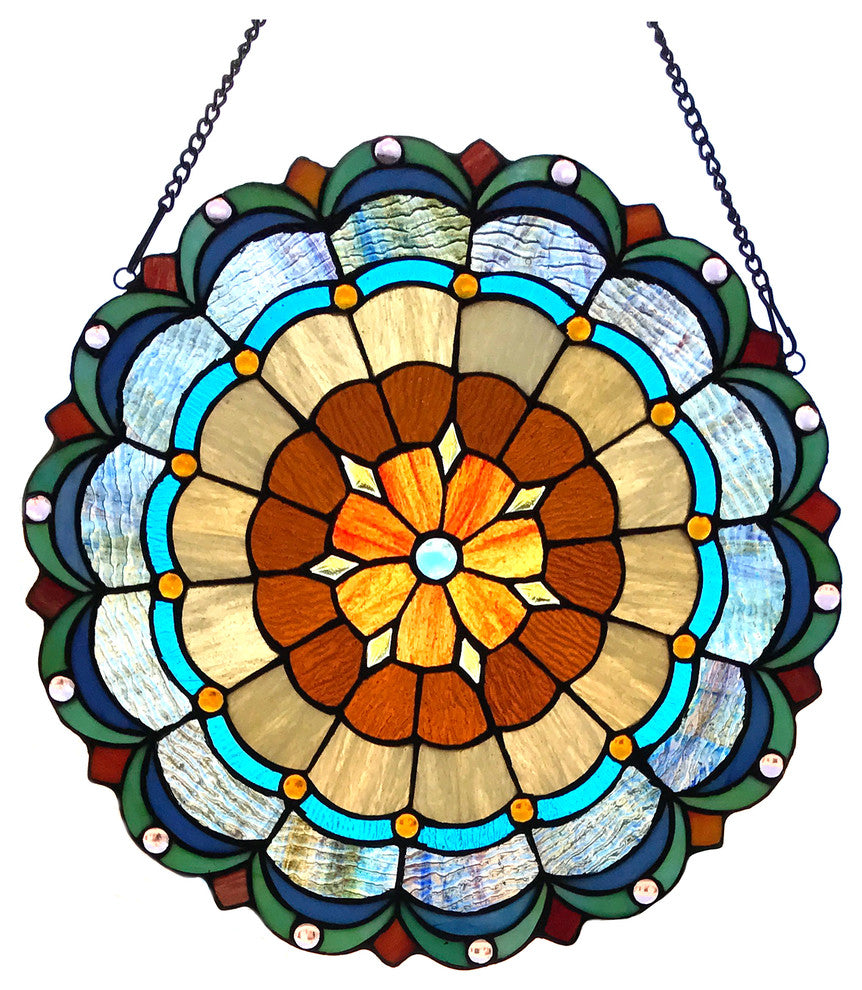 This Tiffany style window panel will add color and beauty to any room. Handcrafted from over 125 of hand-cut pieces of art glass and 36 beads. This window panel delivers shades of orange, brown, blue, and green which will brighten up any room.