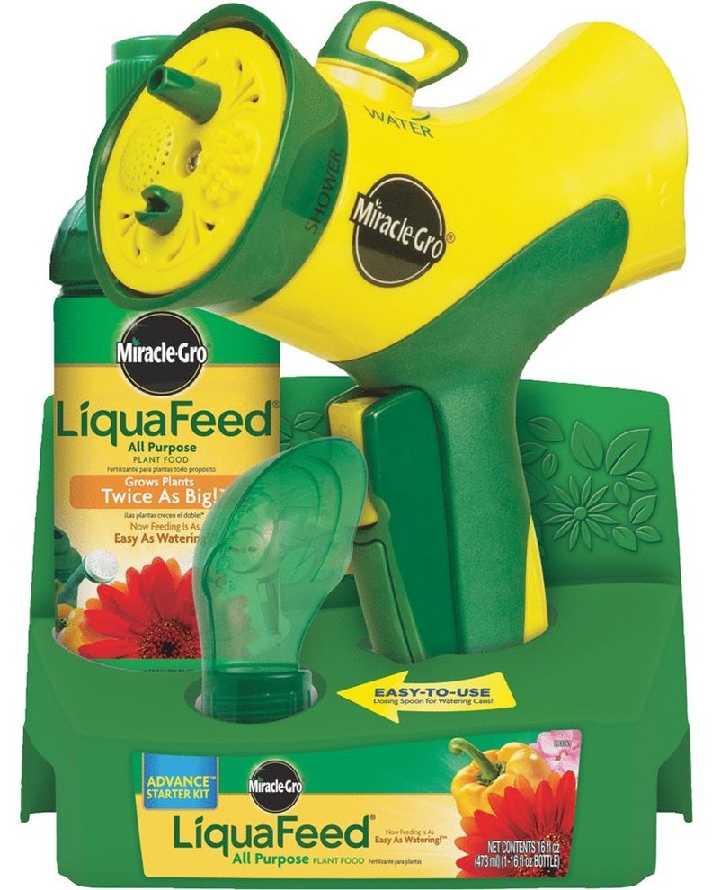 Miracle-Gro LiquaFeed Advance All Purpose Plant Feeding System Starter Kit is the easiest way to feed and water your garden all at the same time features a 4-pattern sprayer and locking trigger to minimize hand fatigue. Stays attached to your garden hose for regular watering. • Comes with the feeder and one 16 oz bottles• Easy to use, attach to hose, insert bottle and spray on to feed and water plants• Automatically mixes the correct amount of plant food with water• Bottle empties in 15 minutes so you know when to refill• Feeds at even rate producing the best results• Guarantees bigger, more beautiful plants.Miracle-Gro LiquaFeed Makes Feeding as Easy as Watering:• Miracle-Gro LiquaFeed is a revolutionary plant feeding system that allows you to feed and water your plants at the same time. There"™s no mixing, no measuring - and no blue fingers! Miracle-Gro LiquaFeed plant food automatically mixes with the water from your garden hose, so the plants receive the exact amount of nutrients they need to help them grow bigger and more beautiful, guaranteed!How to Use:With Miracle-Gro LiquaFeed Feeder:• 1) Attach LiquaFeed feeder to garden hose.• 2) Insert Liquafeed refill bottle by removing cap and twisting into Liquafeed feeder.• 3) Feed by spraying the soil at the base of the plant until soil is saturated.With Watering Cans:• 1) Attach dosing spoon to bottle by removing cap and twisting dosing spoon onto bottle.• 2) Tilt bottle and gently squeeze so that liquid begins to fill dosing spoon. Fill to top line to mix with 2 gallons of water, fill to lower line to mix with 1 gallon of water.• 3) Pour Miracle-Gro LiquaFeed All Purpose Plant Food from dosing spoon into watering can and fill with water. Apply diluted solution to the base of the plants. One gallon feeds approx. 10 sq. ft.When to Apply:• Use to feed all types of in-ground or container flowers, vegetables, trees, shrubs and houseplants.How often to apply:• For best results, use every 7-14 days.Where to Use:• Apply to soil at base of plants.Where Not to Use:• Not for indoor plantsCoverage Area:• 400 sq ft per bottleAssociated Plants:• All plants including vegetables.Benefits:• Makes feeding as easy as watering! Grows plants twice as big!•  • versus unfed plants.Fertilizer Analysis:• 12 - 4 - 8Packaging:• Reusable Plastic Base.