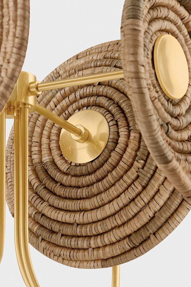 Combining tradition with innovation, Ashby''s graphic design language comes to life with circular motifs and basketry techniques. The woven forms serve as decorative backdrops for each candle, highlighting the precise craftsmanship. The Aged Brass frame includes a disc reflector to direct light outward. Available as a 1-light sconce or 4-light lantern, Ashby brings a touch of global style to modern interiors.