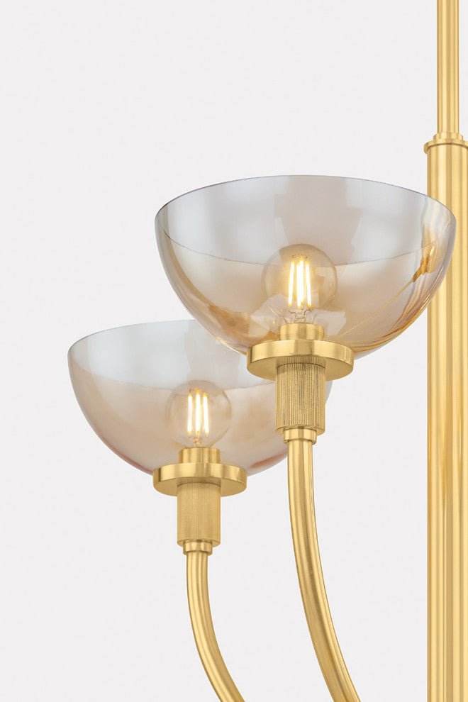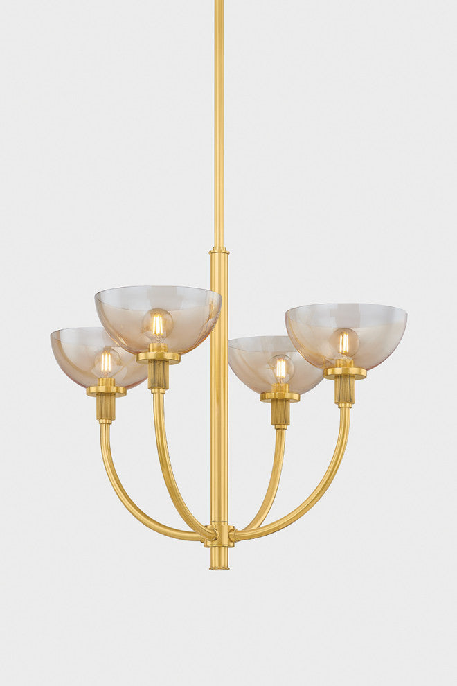 Spare and sculptural, the Eva family takes a classic framework and adds a muted glass finish. Each Aged Brass arm swoops upward to support a light bronze-plated glass shade. A fluted socket cup adds a decorative, textural detail. Available as a sconce or a 4-light chandelier, Eva brings a sense of refinement to both traditional and contemporary interiors.