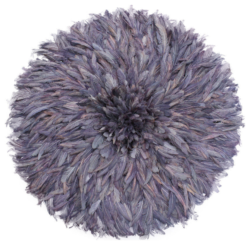 Origin: CameroonDimension: 31 inches/80 cm diameter.Profile dimension from wall surface (when open and suspend): approx. 7inches (18 cm).Color may differ slightly from photos due to different monitor settings. Also, the color may vary from one product to another due to the dye on feathers.Materials: Raffia wood, Hens feathers, fabric, plastic string, dyes for color.Imported. All Juju Hats have been fumigated before importation.Maintenance: Juju Hats need some love too. To maintain a beautiful Juju a little maintenance is necessary. Spray the feathers every 3 to 4 months with an anti-moth to prevent from any damages caused by insects. To remove the dust on the Juju, use a hair blow dryer on low temperature. Keep blow dryer at least 12 inches (or 30 cm) away from the feathers. If needed rearrange the feathers with your fingers.This artful Juju Hat, the Tyn Hat is handcrafted in Cameroon. For centuries, Bamiléké tribes have been making those hats that symbolize prosperity and freedom. Once, Juju Hats were worn by medicine men and royalties during tribal ceremonies. Nowadays, their customs are less restricted during Bamiléké traditional rituals and their beauty has reached homes beyond Cameroon"™s borders. Those headdresses are very impressive hung on walls. Juju hats are made from natural or dyed feathers and woven raffia. Artisans take 2 to 3 days to complete one hat.