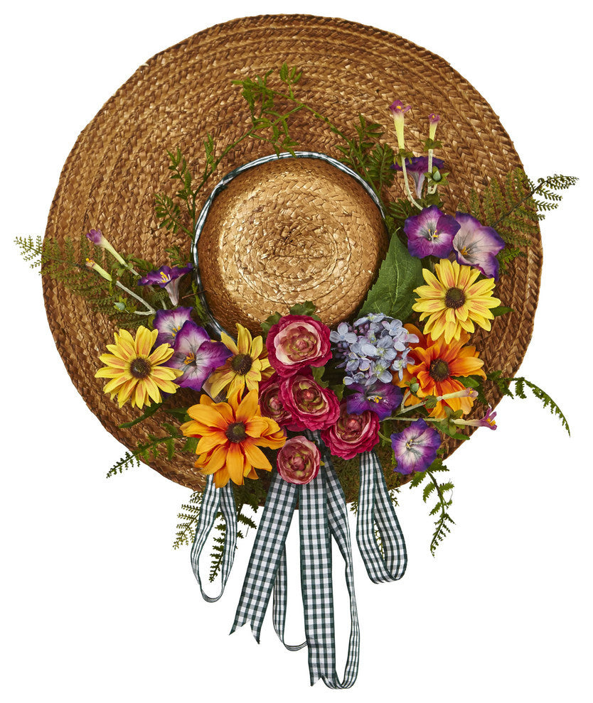 Replace traditional wreaths with farmhouse charm as springtime florals drape along the brim of a large, straw sun hat. Mixed faux florals in brilliant shades of color, bundle with gingham ribbon to create a French country inspired entryway. 18" hat wreath offers a pop of year-round color.