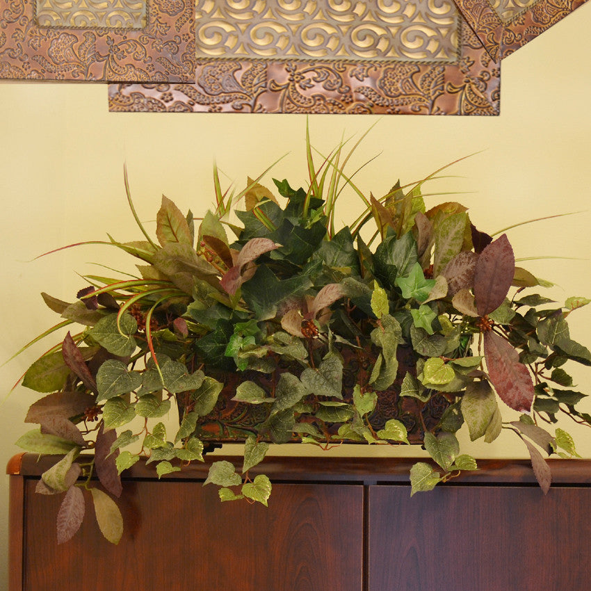 Liven your countertops with this gorgeous ivy, grass and cottonwood arrangement. This mixed silk greenery design displays plum-toned laurel that is complemented by burnished red berries. Displayed in a flowery, green and burnished red container, this delightful mixed faux greenery design measures 14" H X 14" D X 31" W.Features:-Ivy, Grass and Cottonwood Ivy Mix-High Quality Lush Greenery-Custom Made in the USA