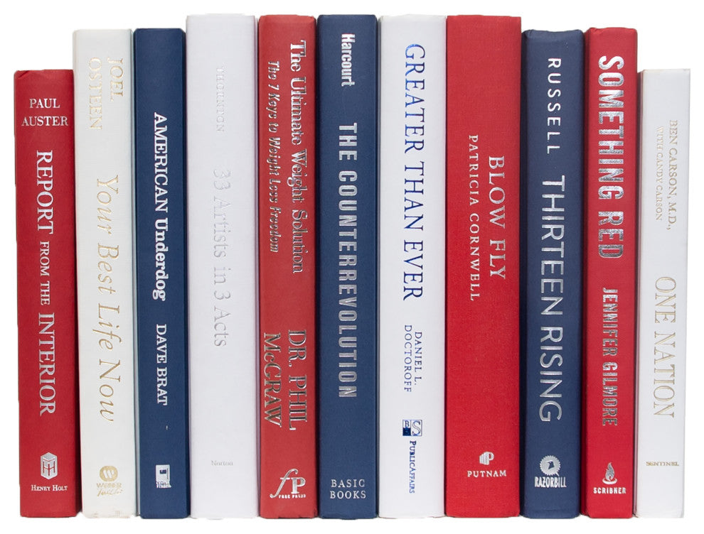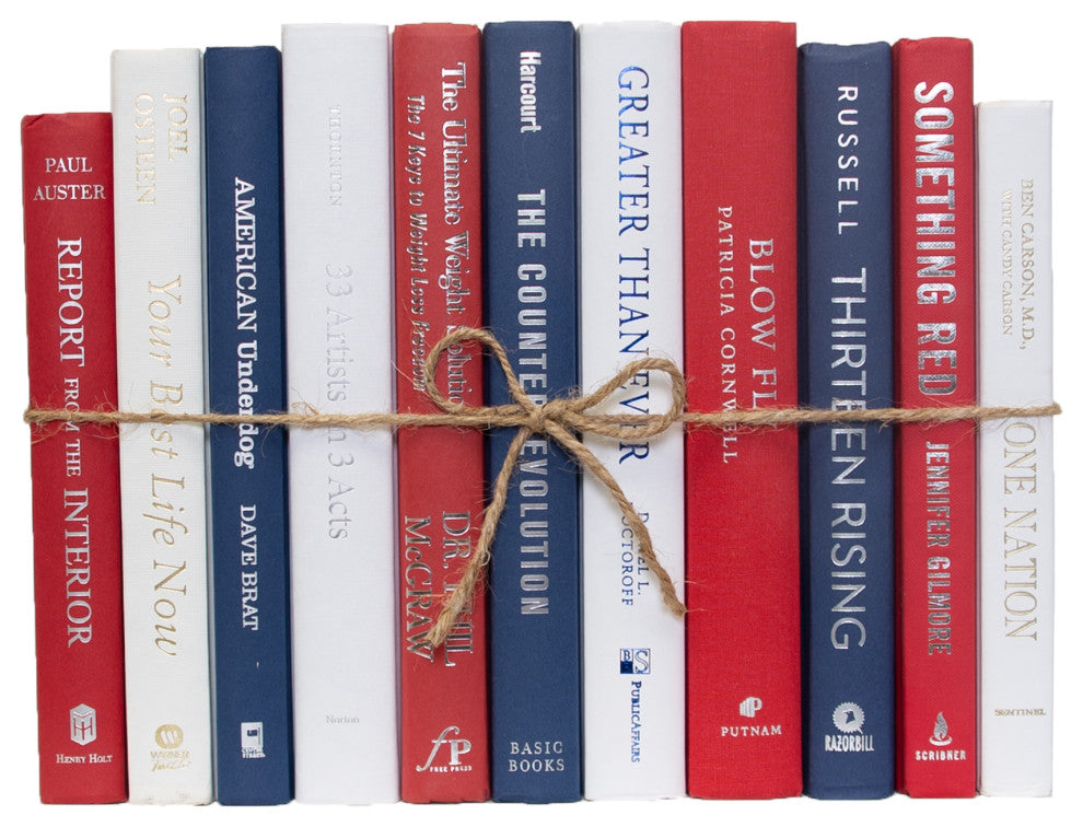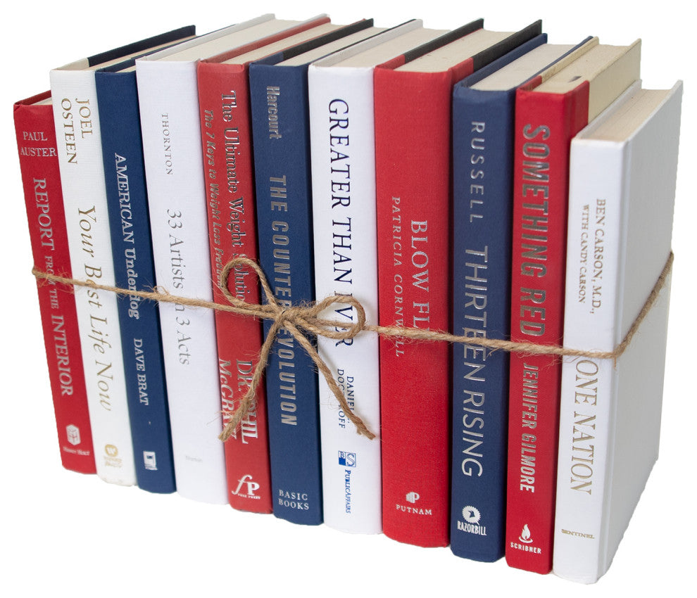 Take your design to a new level with the Modern Americana ColorPak from Booth & Williams. One linear foot of authentic modern hardback books in crisp shades of red, white and blue. All books are published 1980-present and include a variety of literary works, period novels and topical texts with light overall wear. Contains 10-12 books with an average height of 8.5-9.5" and hand-wrapped in jute twine. Order as many ColorPaks as you need to complete your project. Titles will differ from those pictured. If ordering multiple quantities titles may be duplicated.