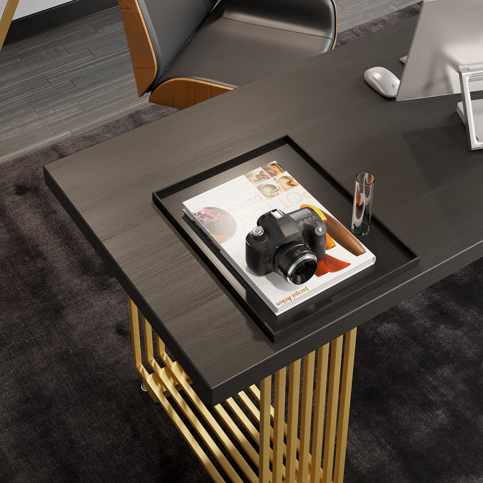 Increase your work efficiency and decor aesthetics of your home office with this modern writing desk. Dark wood veneered desk top of solid wood meets the square frame legs in gold to bring you this simple but fancy office desk. The construction of solid wood and metal ensures a long-lasting usage and look. Buy and bring a touch of modern sophistication and style to your workplace. - Material: Solid Wood, Metal- Finish: Gold- Size Options: Small, Medium, Large- Small Dimensions: 47.2"L x 23.6"W x 29.5"H (1200mmL x 600mmW x 750mmH)- Number of Drawers: No- Assembly Required: Yes