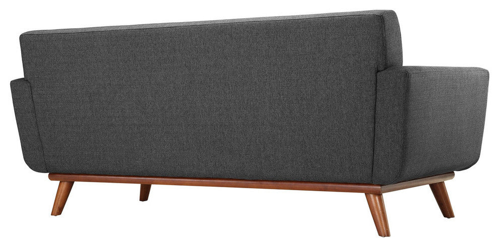 Gently sloping curves and large dual cushions create a favorite lounging spot. Whether plopping down after a long day at work, settling in with coffee and brunch, or entering a spirited discussion with friends, the Engage sofa is a welcome presence in your home. Seven tufted buttons create eye catching appeal; adding depth that brings your sitting decor to center stage. Four cherry color rubber wood legs and frame supply a solid base to the comfortable upholstered material.Cherry color rubber wood, White plastic glides100% polyester material, Chair Weight Capacity - 440 lbs.Overall Product Dimensions: 111"L x 73"W x 32.5"HArmchair Dimensions: 33"L x 40"W x 32.5"HLoveseat Dimensions: 33"L x 78"W x 32.5"HArmrest Dimensions: 4.5"W x 6.5"HCushion Thickness: 6"H