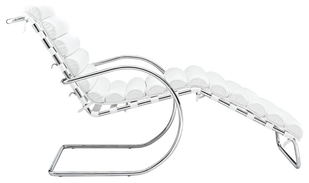 You need to at least imagine water in front of you to fully experience this piece. As with the ripple after-effects caused by the toss of a pebble, there''s no telling where the Ripple Chaise Lounge will take you. For those who appreciate natural resolve, without the need to know the destination point, then Ripple is for you. The rounded polished steel tube arms, and ribbed leather seat, creates an intuitive and free-thinking environment that inspires. But while there is a starting point to this innovative design, there is no foreseeable end to this piece perfectly positioned for progress. For use by the pool, beach, or any patio area filled with that contemporary feel.Modern chair lounge chair, Ergonomic ribbed leather seatFoam padding underneath leather, Polished stainless steel frameOverall Product Dimensions: 66"L x 19"W x 33.5 - 41"HSeat Dimensions: 20"L x 19"W x 21 - 24"HArmrest Dimensions: 1"W x 20.5 - 23.5"HBackrest Dimensions: 19"W x 23.5"HSpace Between Seat and Armrest: 3.5 - 9"HCushion Height: 2.5"HBase Dimensions: 20"L x 19"W