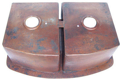 This kitchen copper sink has two standard 3.75 diameter holes, one per bowl and both bowls are the same size. The bowls are 15" long by 14" and 18" by 14" in their shortest and longest widths respectively. The inside depth in the bowl is 10". The front and back borders are 2" wide; the left and right rims are 2" wide and the center one is 1".The copper sheet is 16 gauge (0.05" thickness). The border is flat, which means, the sink can be either under or over mounted.From a copper sheet the wise artisan hands transform it into this unique piece. The hammer footprint is very visible, giving it its own character. The reddish/oxidated texture is characteristic of natural copper when it is cooled down from red-hot temperature using cold water, that specific characteristic is what makes it so beautiful. The finish is in a dark brownish color. Along your home decoration, this piece will add a unique touch to your kitchen making it a very special point of attraction. The patina can be damaged if any abrasive substances stay for long periods of time on the sink surface, because of this, washing it after usage is recommended; besides that, no more maintenance is required."Hand-hammered and mold-cut to perfectionHandcrafted by Mexico''s Finest ArtisansWe include 1" long brown screws in all of our hammered copper switch plates