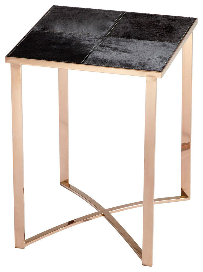 The modern reality table measures 23.5"H x 17.75"W x 17.75"L. It''s made of stainless steel, wood & cowhide with a satin brass finish.