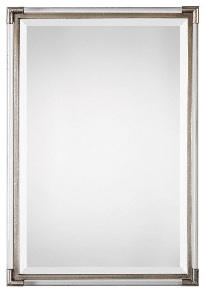 Clear Acrylic Rods Surrounding A Metallic Silver Leafed Metal Frame, Creating A Simple Yet Elegant Mirror Piece That Adds A Taste Of Contemporary To Any Room. Mirror Is Beveled.• 32.75"H x 22.9"L x 1.4" deep. Weighs 18 lbs. Mirror Glass is 30.75" x 20.9".• Hand Finished Acrylic and Metal Frame• Properly weighted hanging hardware attached. Can be hung vertically or horizontally.• Heirloom Quality - Expertly hand crafted and hand finished. Due to the hand crafted nature of this piece, each piece may have subtle differences.