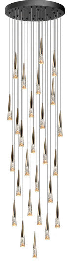 Bring an elegant addition to your indoor spaces with the Crystal Pendant. A stylish contemporary fixture that starts with a smooth disc ceiling mount, it sends down a series of slender cables to suspend conical metal housings at different heights.Details:Material: MetalShade Material: Clear K9 CrystalLighting Style: Soft/Diffused/AmbientLocation Rating: UL ListedWarranty: 1 year limited electrical warrantyFinish: Brushed Brass; BlackDimensions:17 Light Option Canopy: Diameter 24"17 Light Option Fixture: Width 24", Weight 35Lbs17 Light Option Maximum Hanging: Overall Height 140"27 Light Option Canopy: Diameter 30"27 Light Option Fixture: Width 30", Weight 68Lbs27 Light Option Maximum Hanging: Overall Height 140" We accept customization, please contact Akari Lanterns.