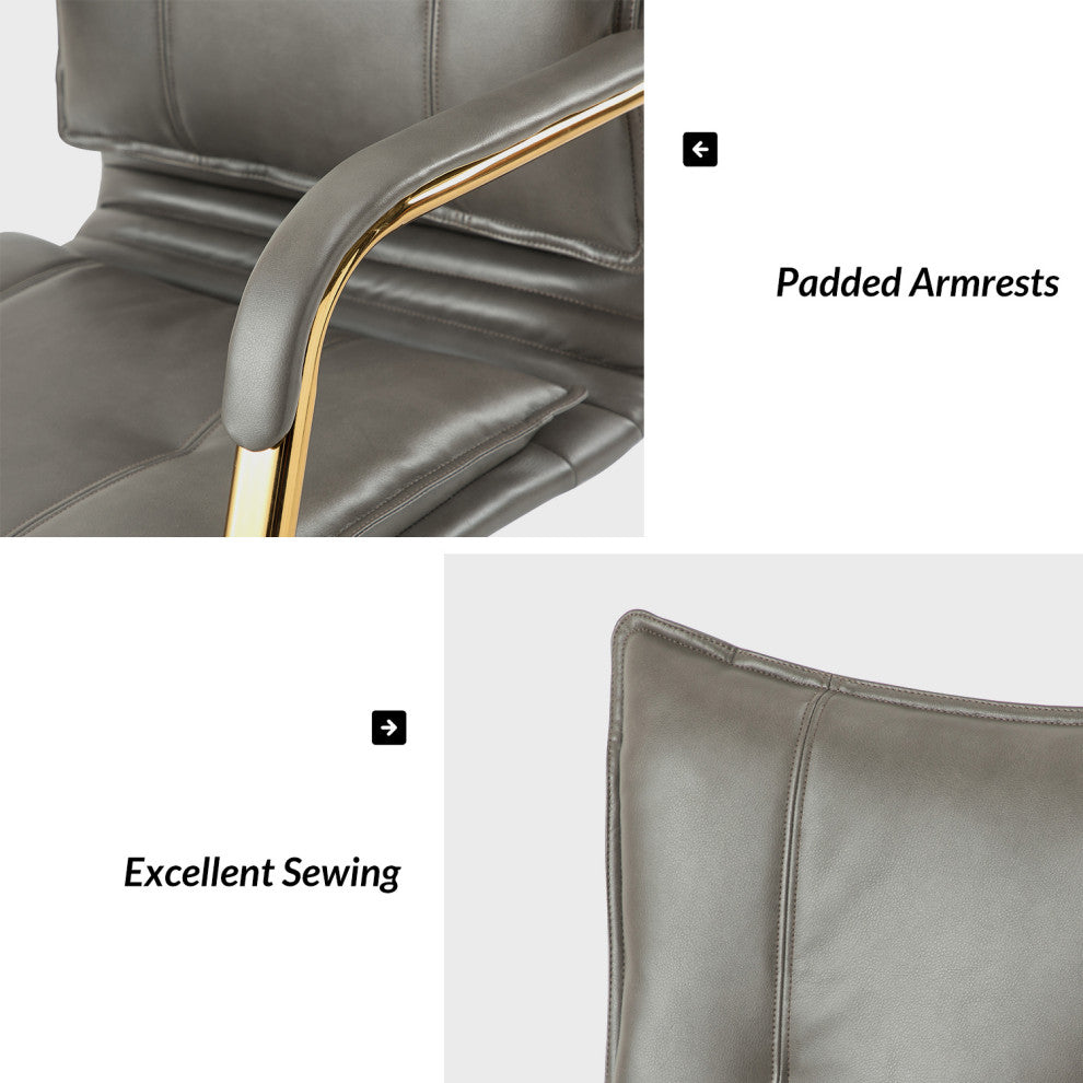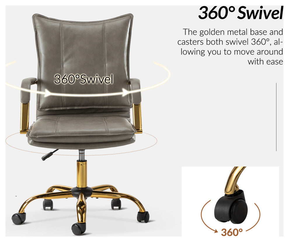 This office chair is an ideal pick, whether you''re completing your home office or office conference room. It''s built with a metal and wood frame and features a comfortable back that provides lumbar support. Comfortable armrests offer additional support as you tackle your to-dos. The chair is upholstered in polyurethane and is filled with foam for just the right amount of cushion. Subtle tufted back and seat create a tailored aesthetic. The star-shaped base has five bent legs with casters that allow you to roll throughout your space. Plus, you can change the height of the seat, and swivel a full 360°.Product Including: One office task chair, assembly required.PU Fabric Covering: The skin-friendly breathable PU fabric adds a chic flair to your workspace and also features a refined stitching detail along the edges to bring character and elegance to any office.Durable and Comfy: High-quality foam filling with a sturdy structure, seat in sheer comfort as the additional swivel and height adjustments please a variety of body types.Smooth and Stable: An extra stable base features a 360-degree swivel with 5 durable casters for strong support and easy movement without scratching your floors. Design: Its classic design along with its tufted back makes this task chair a must-have in your home office. Product DetailsAssembly Required: YesWeight Capacity: 250 lbs Weights & DimensionsItem Size: 22.2"Wx26"Dx40-36.3"HSeat Size: 19.2"Wx20.5"Dx18.2-14.5"HBack Height to Seat: 18.7Leg Height:18.2-14.5 Overall Product Weight: 26lbsSpecifications & FeaturesUpholstered: YesSeat Fill Material: FoamBack Fill Material: FoamFrame Material: Manufauctured wood,MetalArms Included: YesOttoman Included: NoLeg Color: GoldLeg Material: MetalSwivel: YesCountry of Origin: ChinaInstructions:Because the size of the product is measured manually, there may be errors.