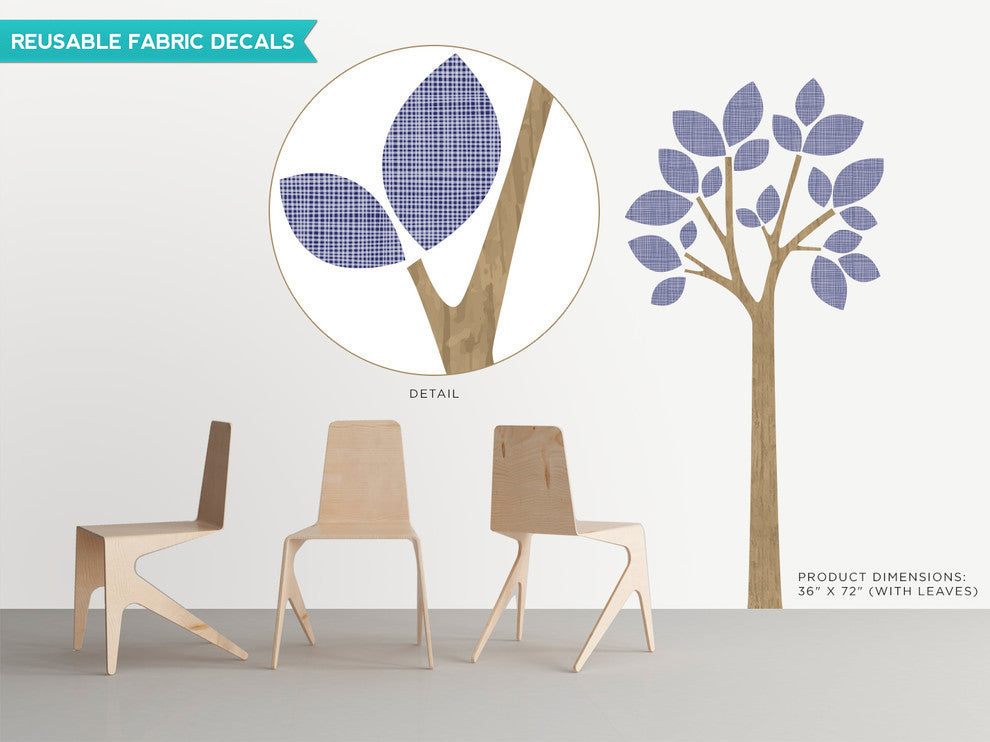 This modern tree fabric wall decal is available in 18 different color options. The trunk and branches of the tree have a wood grained design and the leaves cone with a pattern. The decals are made from a fabric material that is non-toxic and extremely easy to apply. Just peel and stick anywhere. They are repositionable and can be removed without leaving any sticky residue. Tree with individual leaves that can be positioned any way you like Product Dimensions: (width x height) 36" wide x 72" tall Available in 18 color options: 1) Beige 2) Gray 3) Black 4) Blue 5) Brown 6) Light Gray 7) Yellow/Orange 8) Green 9) Charcoal 10) Ivory 11) Navy Blue 12) Orange 13) Pink 14) Purple 15) Red 16) Aqua 17) Yellow 18) Light Purple STILL NOT CONVINCED WHY FABRIC WALL DECALS ARE SUPERIOR TO VINYL? The material for our fabric wall decals is many times more expensive than vinyl but it''s worth the extra cost. It''s made of natural fibers and a water based adhesive so it won''t damage your walls and can be repositioned many times. It''s extremely easy to install because it doesn''t come in a complicated puzzle and you don''t need any tools or diagrams. It won''t shrink or curl like vinyl and the matte finish looks like a mural has been painted on your walls. We have the most competitively priced fabric wall decals that you can find online. Our quality is unmatched and we hope that you love our designs as much as we do!High quality fabric material with a water based adhesive, this is not cheap vinyl like most of the decals you find onlineProudly made in the USA - Non-toxic, Phthalates free, BPA free, PVC freeReusable, repositionable, material will not shrink, stretch, or curl. Our fabric decals will work on most surfaces including textured wallsEasy to apply with no special tools or transfer paper required. Can be pulled apart if it folds over during installation.
