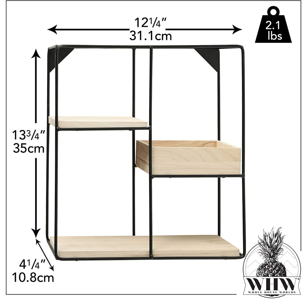 Showcase your stuff and add dimension to your walls with the Industrial Chic Box Shelf Unit. This open sided box shelf is designed to let you express your own personal style within its versatile frames while you save space and keep your stuff organized. Crafted of sturdy iron, this piece includes 2 sturdy solid wood shelves plus a rectangular bin that maximize display possibilities. The natural Paulownia wood is coated with a clear finish that provides contrast to the black iron framework. Well sized, this piece measures as follows: 12 1/4 W x 13 3/4 H inches. The profile from the wall is 4 1/4 inches. Easy to mount, each piece has built in hangers on the upper right and left sides. Decorate any room. Decorative and functional, this unit is well suited to fit with a variety of design themes including calm beach and coastal looks to rustic and modern farmhouse style. Welcome to the product line of Whole House Worlds. The New York based company offers high quality, stylish products for every room in the house, and beyond. From the kitchen, to the living room, to the bedroom, dining room, home office, closet and garden: Our criteria are comfort, quality, style and value.