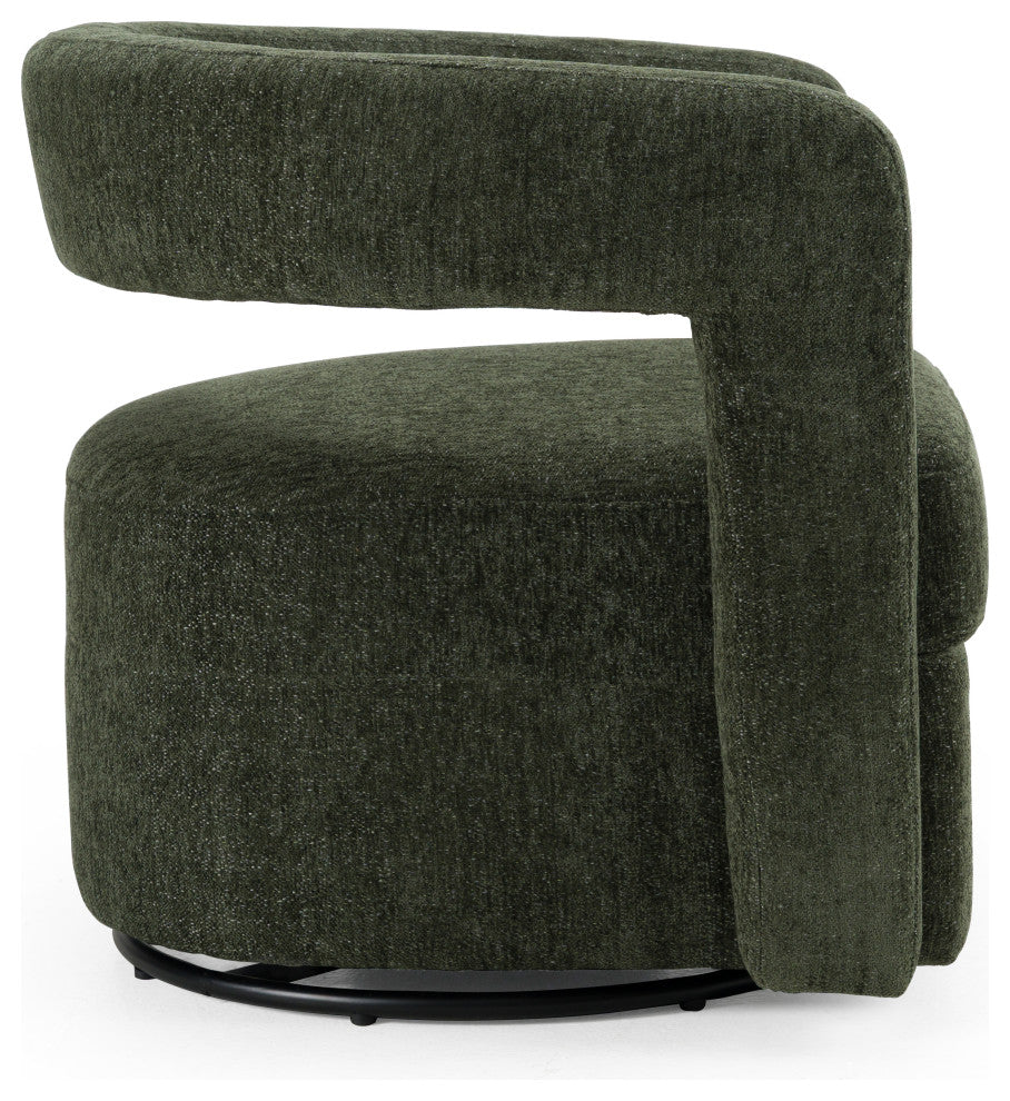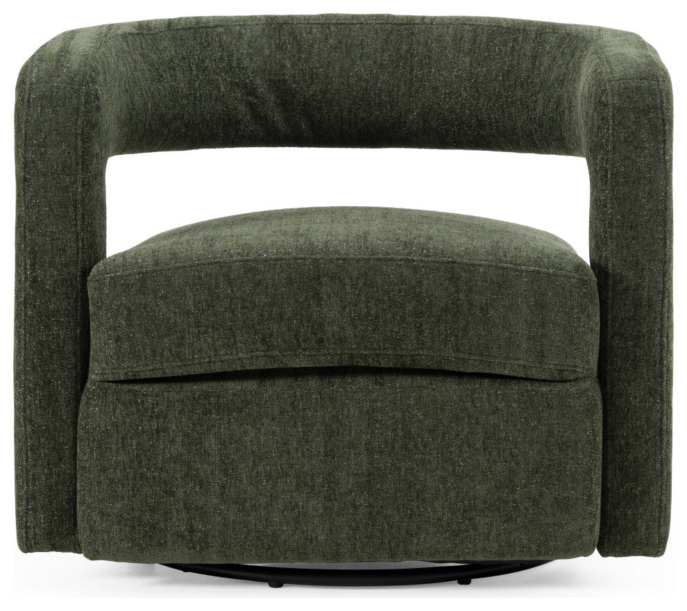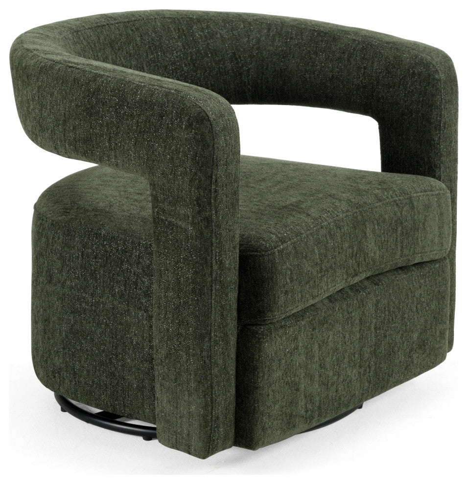 A seamless fusion of modern elegance and luxurious comfort, the Modrest Ryan Swivel Accent Chair brings sculptural beauty to any space. Upholstered in sumptuous olive fabric, its camelback silhouette and gently rounded arms create a sophisticated yet inviting presence. The sleek metal swivel base offers effortless movement, making it the perfect blend of style and functionality. Designed to elevate any living space or reading nook, this chair embodies refined relaxation with a contemporary edge.Upholstered Arm Accent ChairUpholstered In 100% Polyester FabricColor: Olive GreenUpholstery Fill Material: 80% Foam, 20% FiberRound ArmsMetal Swivel BaseWeight Capacity: 330 LbsFrame Material: Solid PoplarSeat Construction: Sinuous SpringsCare Instructions: Wipe clean with a dry cloth Do not use strong liquidFully AssembledDimensions:W29.1" x D25.6" x H30.5"Seat Height: 17"Seat Width: 23.6"Seat Depth: 24.4"Back Height From Seat: 11.8"Base Height To Bottom: 2"Minimum Door Width For Delivery: 29.9"