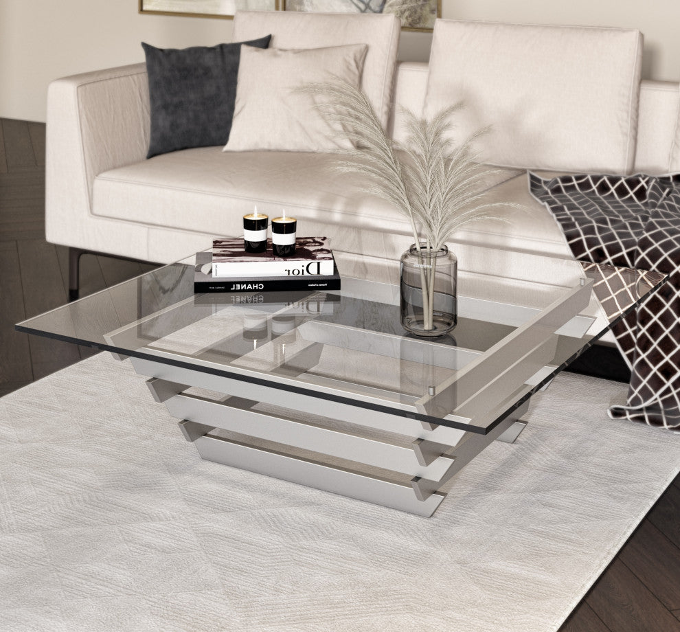 The Modrest Upton Modern Square Glass Coffee Table features a sleek 10mm clear tempered glass top with a uniquely designed stainless steel base. This coffee table measures W39" x D39" x H15".