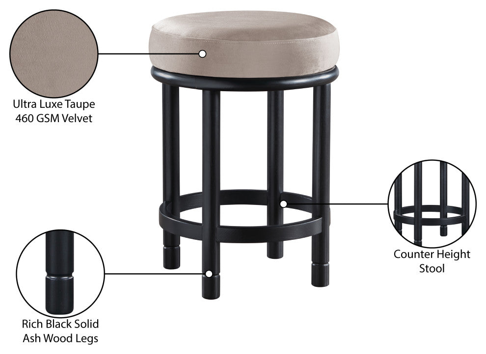 Indulge in the allure of the Taupe Velvet Monette Counter Stool by Meridian Furniture. Its captivating design and luxurious Taupe Velvet elevate any space with effortless elegance. Crafted with precision and durability in mind, this stunning piece becomes the focal point of gatherings, fostering moments of connection and warmth. Embrace sophistication and style with the Monette Counter Stool, a testament to exquisite taste and timeless beauty.Overall Product Dimensions: 18" W x 18" D x 26" HUltra Luxe Taupe VelvetRich Black Solid Ash Wood Legs460 GSM VelvetCounter Height StoolContemporary DesignSeat Dimensions: 18" W x 18" D x 26" H