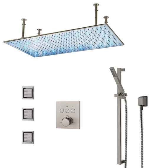 RAINFALL SHOWER SYSTEM: The Monreale 20• 40"Brushed Nickel LED Ceiling Mount Rainfall Shower System with Handheld Shower and 3 Jetted Body Sprays is the ideal shower set for those who want luxury, style, and functionality. This system includes a rainfall shower head, a handheld shower, and three jetted body sprays.DURABLE SOLID BRASS MATERIAL: The ceramic and high-contrast brushed nickel finish of the bathroom shower head adds a touch of style to your decor, while the multiple-layer plating process prevents corrosion and tarnishing due to daily use in the humid environment. The brushed nickel finish of the shower head rainfall also resists scratches and corrosion with stainless steel construction for durability and performance.HIGH-PRESSURE RAINFALL SHOWER: The advanced design makes good use of air and internal passages to evenly distribute the water pressure in each outlet. Our rainfall shower head with a handheld is a must-have for the family. It can relieve your body and improve the comfort and pleasure of bathing. The shower system is modern and elegant in design, adorning your bathroom.LONG-LASTING DURABILITY:The elegant, Brushed Nickel-finished, and sleek-looking shower system complements any decor. In addition, our products are made of high-quality materials, anti-rust, and have long-lasting durability. The high-quality solid brass material doesn''t pollute water, providing a better bathing environment for you and protecting your skin.100% CUSTOMER SATISFACTION: Your satisfaction will always come first. We try to offer you products and services of the highest caliber. So, if there is ever a situation when you are not entirely satisfied with the led rainfall shower system with the handheld shower, please get in touch with us so that we can guarantee your complete satisfaction.PRODUCT DESCRIPTION:Monreale 20• 40"Brushed Nickel LED Ceiling Mount Rainfall Shower System:For those who want luxury, style, and functionality, the Monreale 20• 40"Brushed Nickel LED Ceiling Mount Rainfall Shower System with Handheld Shower and 3 Jetted Body Sprays is the perfect shower set. This system gives you the best showering experience possible by including a handheld shower, a rainfall shower head, and three jetted body sprays. Because it is made of high-quality brushed nickel, the wall-mounted shower system will last for many years. A great place to look for a new shower system is Bathselect. We offer the styles, finishes, and shapes you want.Strong flow, built-in high-pressure water mist mode, and minimal splashing. Useful hand-pressed button. Suitable for hotel and home bathrooms. The solid brass shower head set comes with a shower nozzle that is appropriate for use in shower rooms and bathrooms at home. With the included ceiling and mounting accessories and screws for simple installation, it is simple to install and remove. You can tell when to replace the faucet by looking at the clear water level on the led rainfall shower head.PRODUCT FEATURES:Feature: LED Shower HeadStyle: ContemporaryInstallation Type: Ceiling MountCold/Hot Control: Thermostatic ControlType: Fixed Support TypeSurface Finish: Brushed NickelMaterial: Solid BrassSurface Treatment: BrushedBody Jets Size: 5• 5inThread: G1/2"Hose Length: 1.5mShower Head Size: 20• 40inShower Head Function: Rainfall