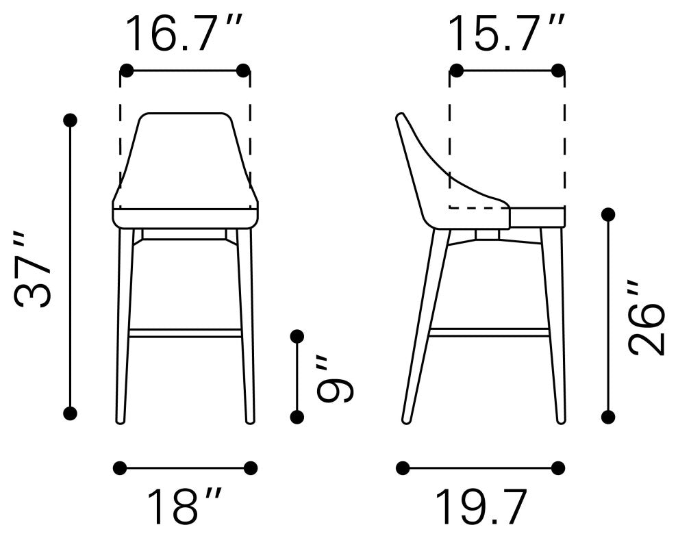 Moor counter chair features an exquisite slim wing back style back and plush seat with contrasting accent trim detail and a sturdy all wood base/footrest in warm walnut finish. Color options soft leatherette in either dark Gray or beige with white trim.