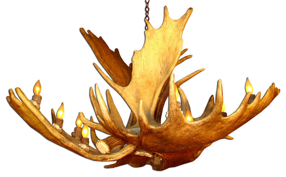 Real Antler Moose Chandelier (36-42"D x 27-29"H), 12 Light Sockets, 6 Feet of rustic bronze chain.Handmade in North America using top quality naturally shed real antlers. Sockets are made to resemble real antler, each socket rated up to 60 Watts. Comes balanced and ready to hang. Frosted Bent Tip Candelabra Bulbs included. Certified in U.S & Canada (CSA listed to comply with UL 1598).