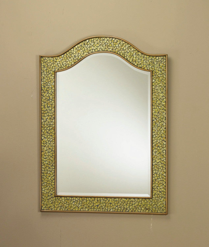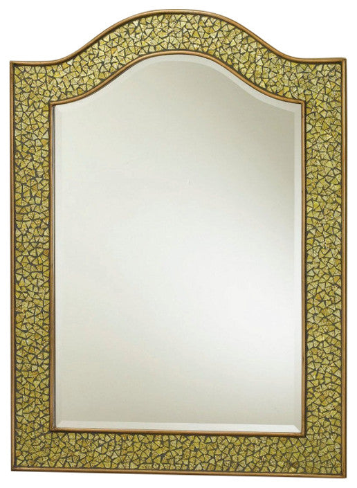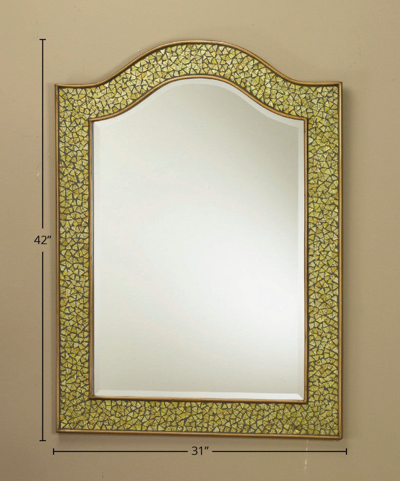 Add a touch of glamor and elegance to your walls with the Mosaic Glass Bordered Beveled Mirror. The mirror''s dramatic design makes for a great statement piece for your vanities or console tables. With a slightly arched top and mosaic pieces making up the border, the mirror is sure to accent spaces in an elegant manner. You can place this in your foyers, hallways, and even bedrooms.Features:Overall product dimensions are 31" W x 1" D x 42" HThe border is made up of individual mirrored glass piecesMirror itself has a beveled design that adds visually appealing, elegant aestheticIts smooth surface makes it easy to maintain and cleanAvailable in multiple color variationsDimensions:MirrorAssembled Product: 31 inches wide x 1 inch deep x 42 inches high.