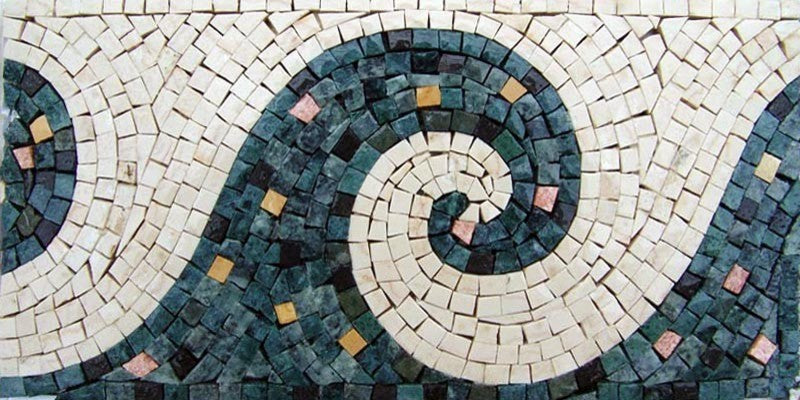 A mosaic tile pattern border made from green sea waves perfect for fixing up bathrooms and pools. This decorative mosaic pattern design is handmade all from marble and natural stones.