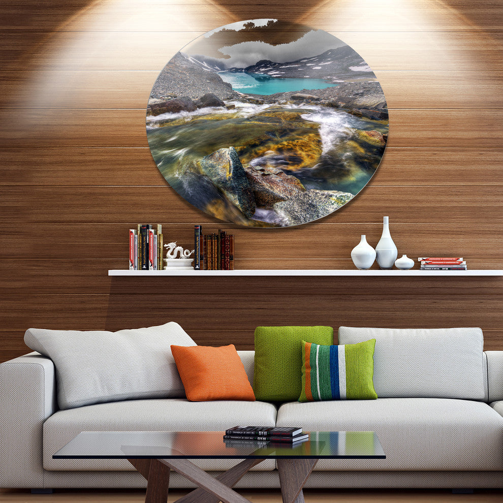 Mountain Creek Flowing Into Lake, Landscape Round Metal Wall Art, 11"