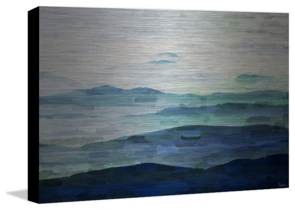 Striking and unique, the "Mountain Tops" UV Ink Print on Brushed Aluminum by Parvez Taj will bring your walls to life. Printed on aluminum, this 45 inch wide by 30 inch tall contemporary artwork will make a statement in any living room, dining room, or bedroom.- Fine art UV ink print on brushed aluminum by Parvez Taj- The aluminum pops the colors and creates an iridescent shimmer, which gives depth to a room- Arrives ready to hang - Includes a certificate of authenticity- Artist signature on the front