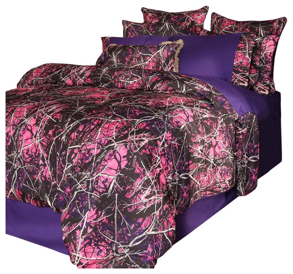 If you, re scouting for style, look no further than our new Muddy Girl Camo set, a bold, feminine statement for the rough-and-tough camo buff! Disruptively patterned branches stand out in sharp relief against a dark purple background, creating a wild and outdoorsy look. Combine with dark purple sheets and matching drapes, shower curtain, and valance to create a coordinating, unspoiled environment. When it comes to your terrain, don, t conceal your fashion zeal! Aim for Muddy Girl Camo, the perfect ammo.