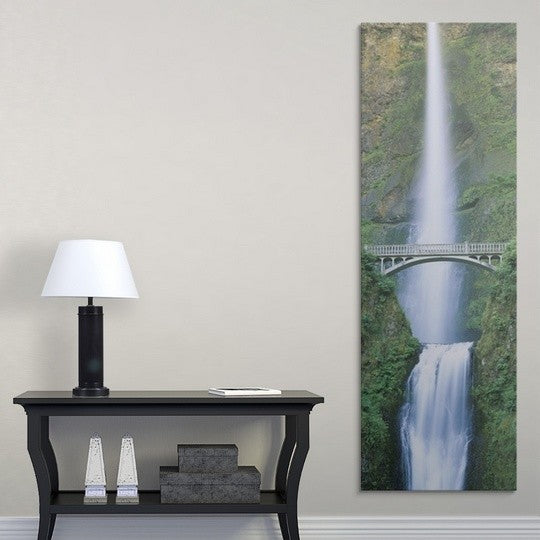Gallery-wrapped canvas entitled, "Multnomah Falls OR".Panoramic photograph displays an enormous waterfall cascading down a rocky cliff and landing into a pool of water that itself leads to another waterfall. In the center of a picture, an ornate bridge can be seen spanning two landmasses and sitting in front of the waterfall.Our wrapped canvases feature a proprietary design that prevents warping or sagging over time. By using archival inks and artist-grade canvas, our premium canvases are sure to add that extra touch to any space. Lastly, our canvases are finished with a closed back that incorporates pre-installed hanging hardware for easy installation.