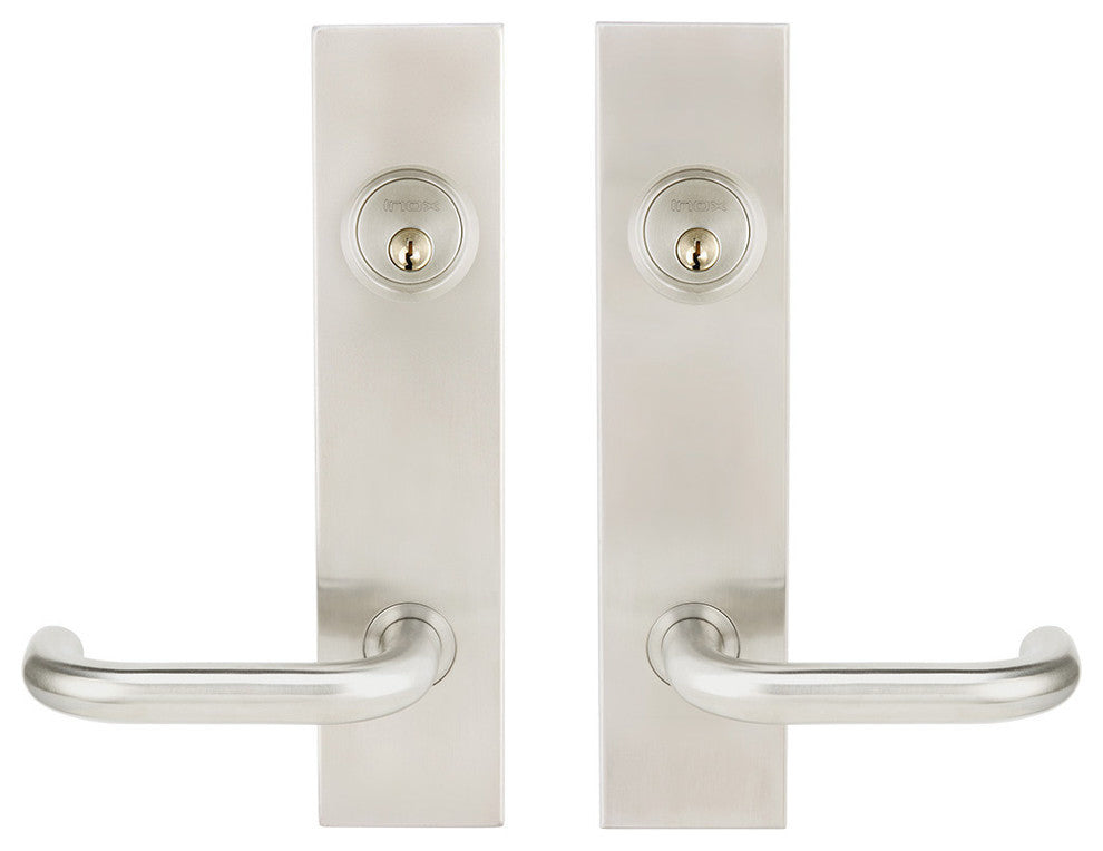 Entry Handleset with SF Plate, 102 Munich Lever, TL4 Tubular Entry, Double Cylinder, 2-3/4" Backset, Satin Stainless Steel (US32D/630)Stylish, contemporary designStainless Steel construction for long lifeSuitable for most commercial and residential door types 1-3/8"-3"; thick door kits availableConcealed fixings; spring-assisted chassisMultiple escutcheons and functions to suit different applications