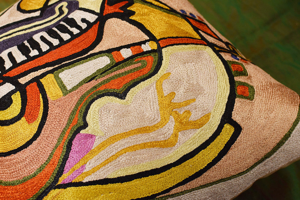 Kashmir is proud to bring together the modern abstract artwork pillow collection, inspired by world renowned artist Alfred Gockel and hand embroidered by the finest artisans of Kashmir, into the living spaces of patrons and connoisseurs"™ all around the world. These unique and modern pillows would bring the brighter elements of any room, creating a harmonious design and perfect air of sophisticationThis decorative Cushion Cover Music is my Life throw pillow cover has beautiful colors and design hand embroidered in lively and refreshing colors. Swirls of colorful chain stitch embroidery hand embroidered from soft Kashmir wool adds a dazzling sheen to the creation. The eye-popping color and pattern of this creation is just what the designer ordered to create a fiery focal point in your décor. This all-natural accent pillow cover makes an enduring impression.Composition: 70% Art Silk, 30% CottonSize: 18"³ x 18"³ (45cm x 45cm)Backing: Canvas ( See Last Picture )Pillow Insert not Included (Only Cover is on Sale)Hand embroidered in Village Cottage Units A close-up view of this abstract pillow cover allows you to see the amazing chain-stitch embroidery work of master artisans who have practiced this art their entire lives.Chain stitch embroidery on a cotton base produces a soft, fine crewel, and the stitches create definite swirls as distinct as your fingerprint. Kashmiri craftsmen produce the finest quality chain stitch needlework in the world. This abstract decorative pillow cover could grace the cabin of your boat or the chair in your solarium and yet be equally as comfortable in your den. Durable and easy to clean, this toss pillow will catch the eye of every passerby. The eye-popping color and pattern of this modern throw pillow is just what the designer ordered to create a fiery focal point in your décor. Perfect wherever you need a splash of color, this art work pillow creation is as durable as it is beautiful. Easy to care for, this cushion cover could spark up an old throw pillow or grace a new pillow form. World-renowned artist Alfred Gockel was born in 1952 near Münster, Germany. His artwork has been showcased in leading exhibitions all over the world. He draws his inspiration from: Picasso, Mirò, Chagall, Dali and Durer. He is a great admirer of Kandinsky. This is reflected in his high quality and artistic etchings.His particular focus is the art in public spaces. Alfred feels attachment to an art form, which includes design that leads to beauty and harmony. His vivid style is a sign of spontaneous creativity and artistic energy. The bright colors and the graceful motion of his characters mark his beautiful and artistic compositions, which reflect zest of life and push his works to a higher level of visual pleasure. He loves playing with form and color in a virtual way and describes his creative work as "œrhythmical painting"� His artwork seems to explode of vitality.The tremendous drive of his painting puts his characteristic figures and compositions in vibrations, which reflect consequently the motion in his artwork.Dance and music are his favorite themes. His originals begin as brief sketches to grip creative moments, which inspire him later and retain the charm of his drafts while he finishes his paintings.