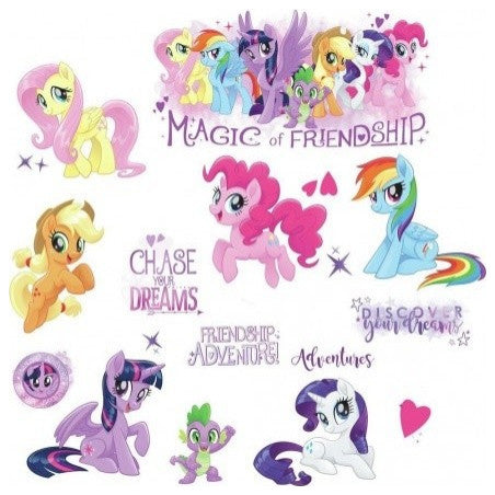 Decorate walls With My Little Pony the Movie Peel and Stick Wall Decals With Glitter by Roommates. Complete With 18 decals, this wall sticker set is a fun and creative way to transform any room in seconds. To apply, simply peel and stick decals to any smooth, flat surface. Remove, reposition and reuse as often as needed. Created With high quality vinyl that''s made to last, walls stay completely safe, and sticky residue is never left behind. It''s fast, fun and affordable wall decor at it''s best.