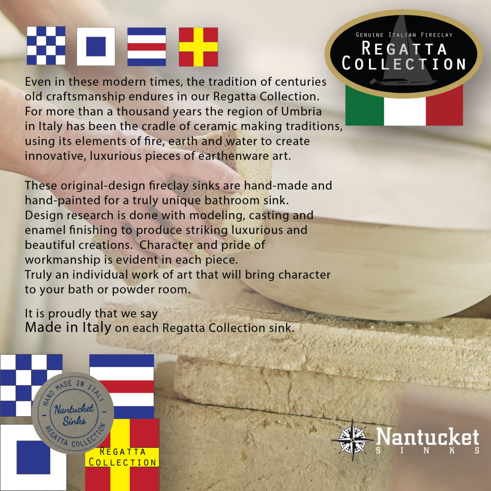 The Regatta Collection Sanremo sink adds luxurious flair to your bathroom vanity. Designed as a topmount drop-in sink, it is a classic oval-shape made of genuine Italian fireclay. Stunningly decorated with a hand-painted, 24k gold leaf spiral band on the interior of the bowl as well as a 24k gold leaf covered rim. An overflow drain adds to the design of this elegant sink.Exterior Dimensions: 19.5" x 16" x 8"Interior Dimensions: 16.5" x 13.75" x 6.75"Designed and hand finished with genuine 24K Gold leaf in ItalyFireclay is non-porousFired at high temperatures, this sink is stronger than typical bathroom sinksSink has an overflowDimensions are nominal and may vary by .25"Takes standard 1.75" vanity drain (Drain not included)Finish: Glazed Color: White / GoldMount type: Topmount/Drop-inShape: OvalOur Regatta Collection are hand finished fireclay bathroom sinks inspired by the world''s most beautiful ports of call. Like a sailing race involving artistry and technique, these sinks embody Italian craftsmanship. Forged from fire, shaped and designed as objects of art, they are daring in their style. Beauty is on full display in these original pieces for your vanity.