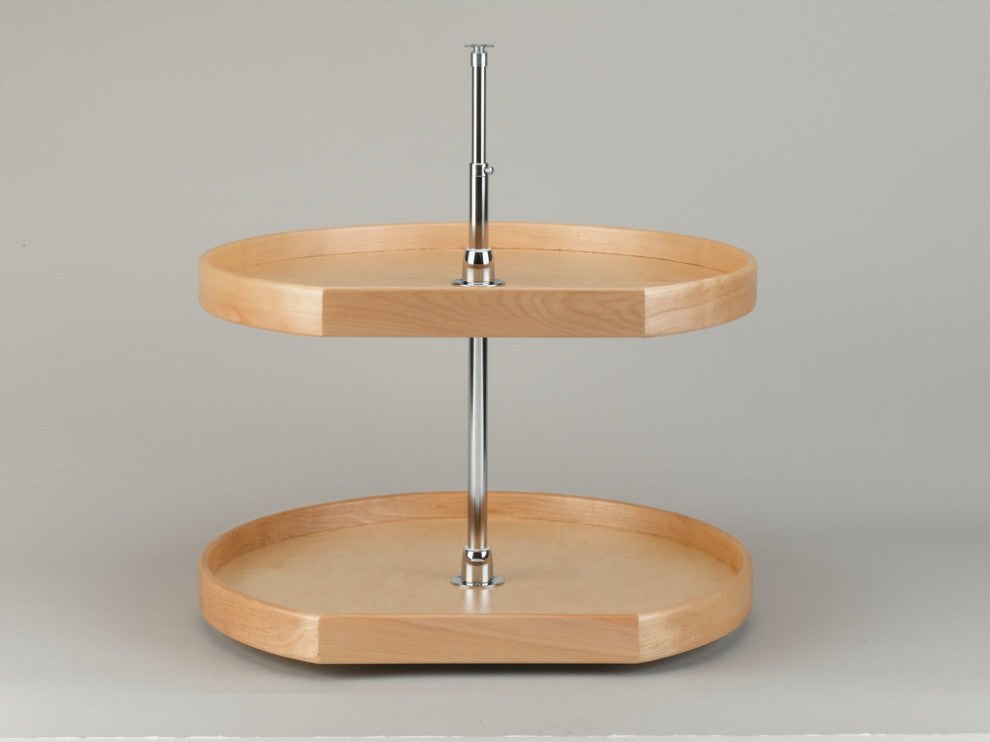 Rev-A-Shelf''s 4NW series lazy susans are at the top of the line when it comes to lazy susans. Whether you are replacing an old unit or just adding a lazy susans to your corner cabinet, you will not be disappointed with the 2-3/8" steam bent rim, 5/8" thick Maple tray bottom, beautiful chrome accent hardware and the overall furniture grade construction. This tray is above the rest.-Included: (2) Shelf Wood D-Shaped set with telescoping shaft and mounting hardware-Independently rotating chrome plated metal hub Included:-Doweled reinforced butt joint for strength-Furniture grade steam bent solid wood rim -Shelves are adjustable once installed from 26" to 31"-Designed for Corner Base Cabinets-Construction: Fully Assembled Maple Wood construction with a clear coat finish for durability-Shelf Weight Rating: 20 lbs. per sqft