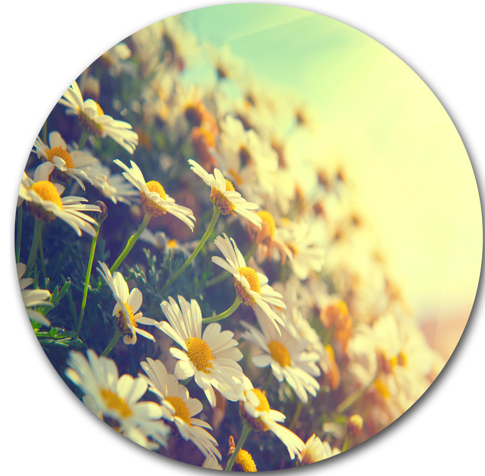 Bring Contemporary Abstraction to your home with this large Circle Metal wall art. This Nature with Blooming Chamomiles Metal Artwork makes it the focal point of any room or office.