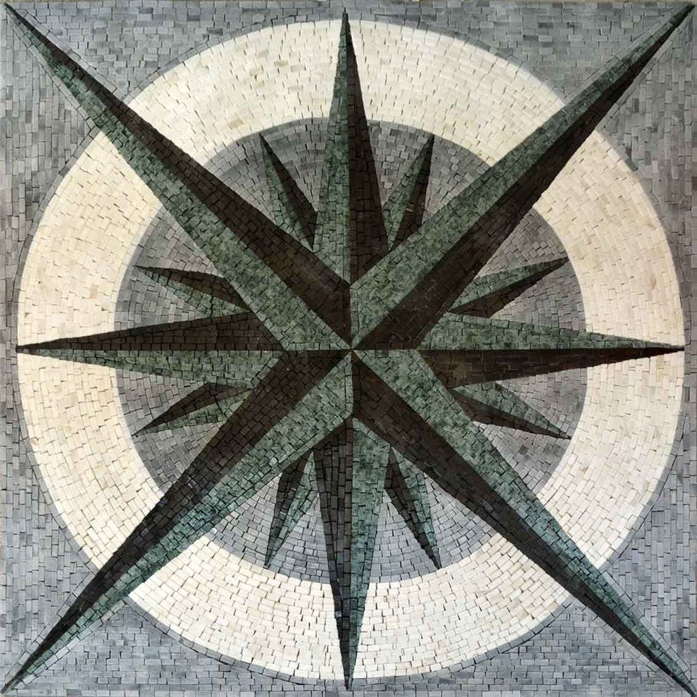 Show your love for the open sea with the Doris nautical mosaic square. It features a stunning maritime wind rose in green and black against a gold and ivory background. Brighten your wall or flooring decor with this bold mosaic. Available in custom sizes.Brighten up your walls or outdoor courtyard with one our mosaic patterns!