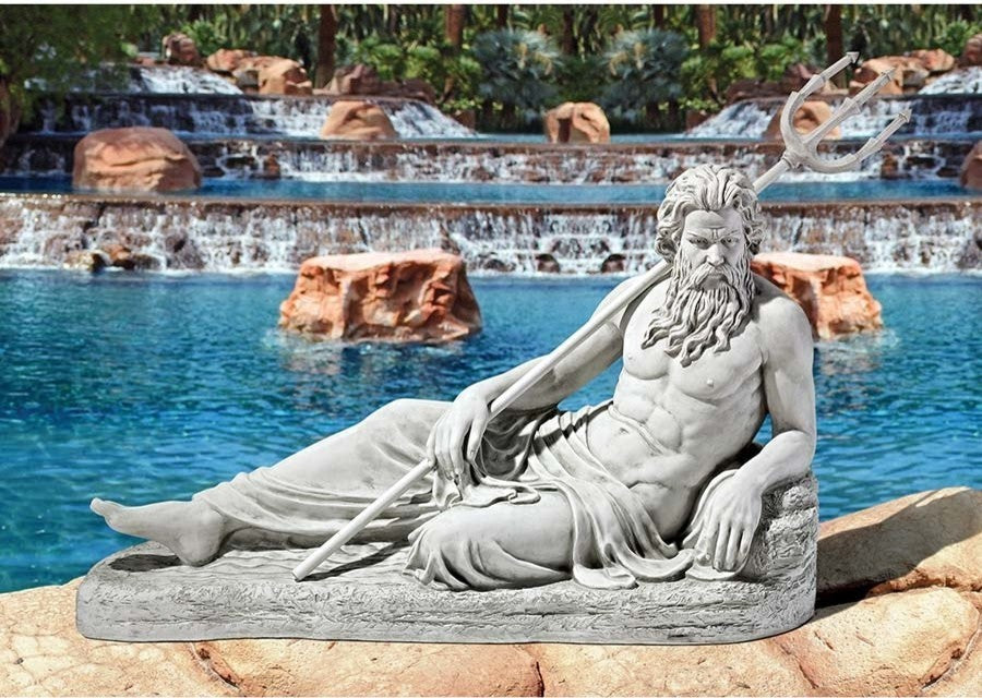 Celebrate the endless power of the ocean near your pool or pond with mighty Neptune, Father of the Sea. Now residing near the mouth of the great river for which he is alternately named, "Father Thames" was originally sculpted for a fountain on the grounds of the Crystal Palace near Lechlade. Sculpted and cast exclusively for Design Toscano in quality designer resin with an antique stone finish, this almost 4-foot long statue is grand enough to command an audience near pool, pond or outdoor spa. 46"Wx17"Dx33"H. 40 lbs.