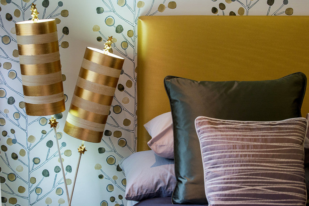 Accent your bedside nightstand or living room side table with the Nettle Luxe Table Lamp. Eye-catching in design, the Nettle Luxe Table Lamp features two arms adorned with gold and cream striped shades. With a spiked nettle finial top, the Nettle Luxe Table Lamp will effortlessly complement your eclectic home decor.