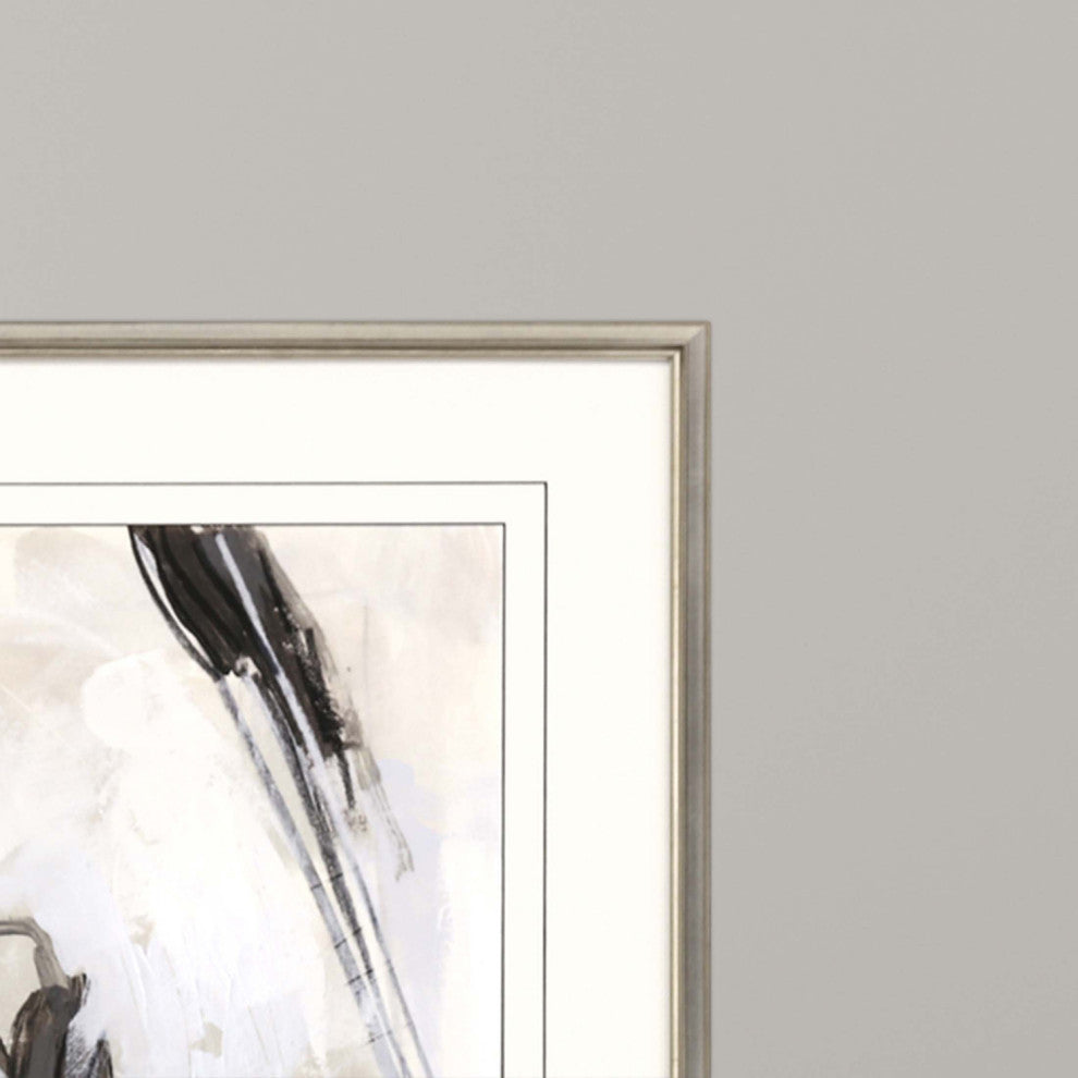 Boundary lines intersect at multiple points in a geometric interlude. Matted in white. Framed in a silver wood shadow box moulding with dark accents.