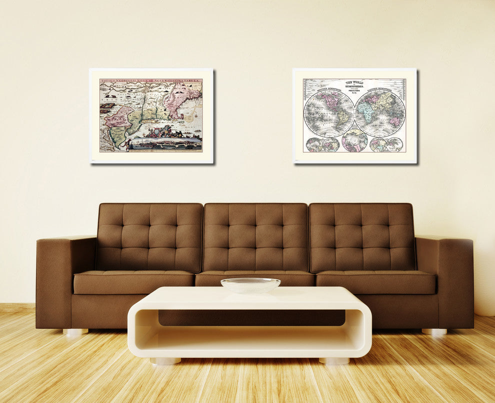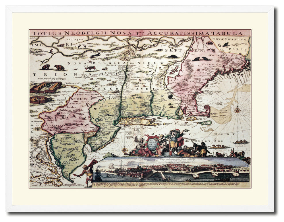 New England Vintage Old Map Print On Canvas With Picture Frame 28" X 37"