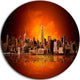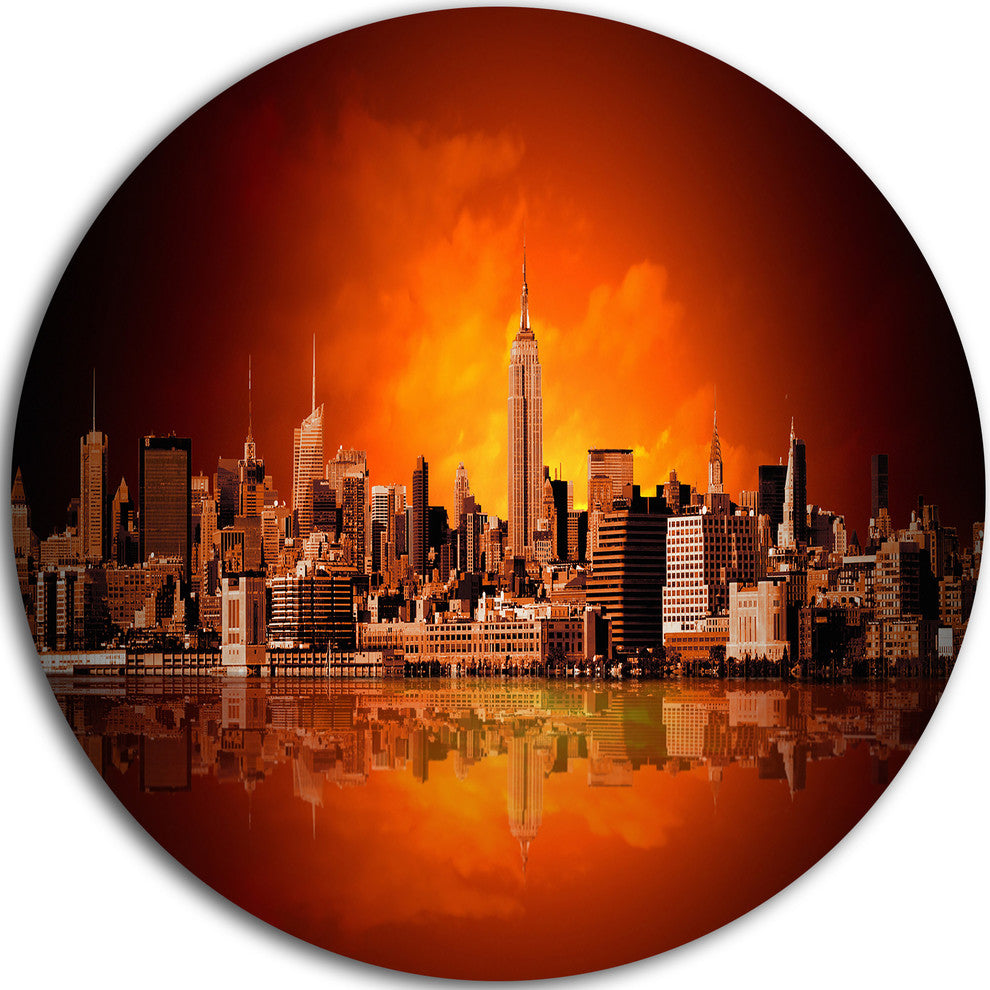 New York City Panorama In Red Light, Cityscape Round Metal Artwork, 23"