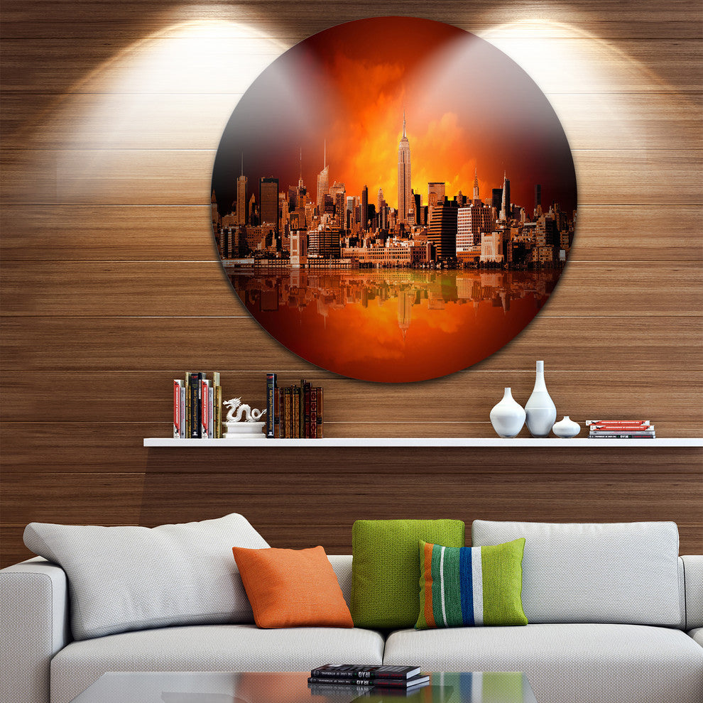 New York City Panorama In Red Light, Cityscape Round Metal Artwork, 36"