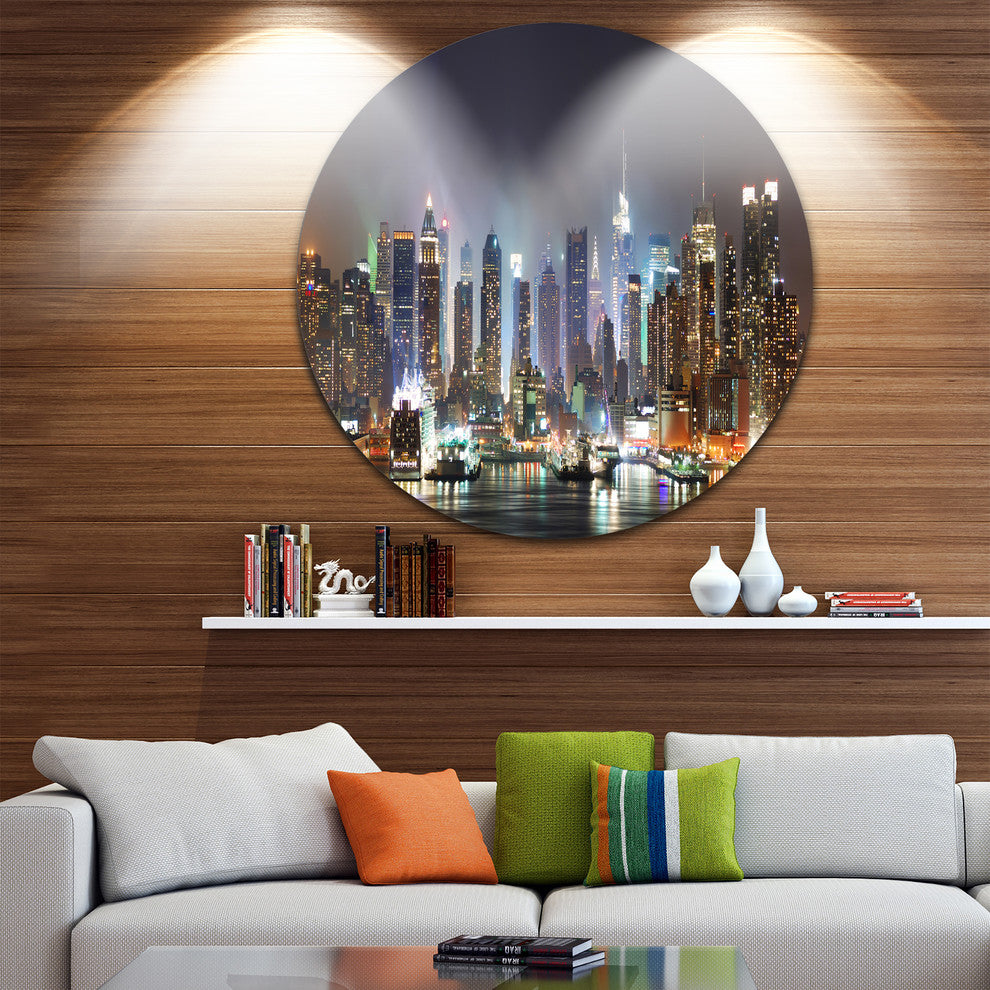 Bring Contemporary Abstraction to your home with this large Circle Metal wall art. This New York Times Square in Blue Light Metal Artwork makes it the focal point of any room or office.