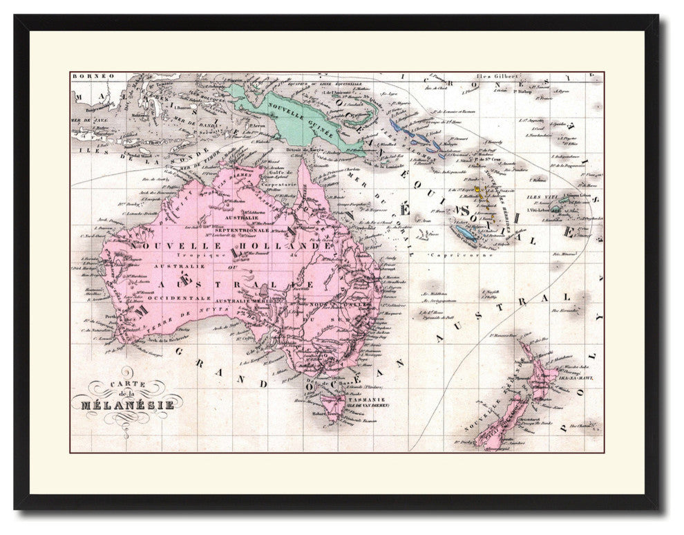 New Zealand, Oceania, Australia Map Print On Canvas With Picture Frame 28" X 37"
