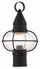 The Newburyport outdoor post lantern boasts classic nautical and railway styling with a beautiful hand blown clear glass globe and a black finish over the solid brass construction.