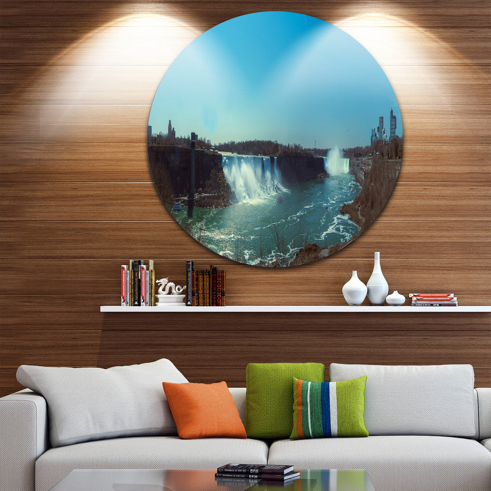 Bring Contemporary Abstraction to your home with this large Circle Metal wall art. This Niagara Falls Viewed from Canada Metal Artwork makes it the focal point of any room or office.