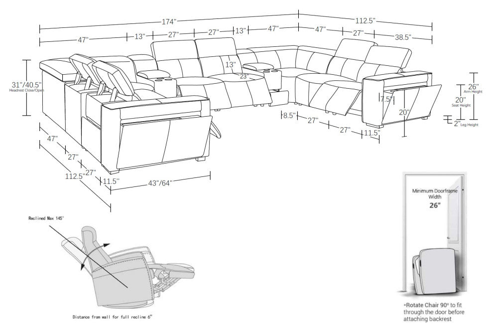 Transform your living space with the luxurious Top Grain Italian Leather U-Shaped Sectional, designed to offer the perfect combination of comfort, style, and modern convenience. This sectional features 4 power reclining seats, each with power headrests and lumbar support, ensuring that every seat provides optimal relaxation. Adjust to your ideal position with just the touch of a button, whether you"™re lounging, watching a movie, or hosting friends.Crafted from Top-Grain Italian Leather, known for its durability, rich texture, and timeless elegance, this sectional adds sophistication to any room. The solid Brazilian wood frame ensures long-lasting strength and stability, making this sectional a reliable and stylish addition to your home.Designed for convenience, the sectional includes built-in consoles that offer cup holders for easy access to your favorite beverages, storage drawers for keeping remotes, magazines, or other essentials neatly organized, and hidden storage compartments in the arms to keep your space tidy and clutter-free.Whether you''re outfitting your home theater, upgrading your living room, or creating a cozy family area, the Top Grain Italian Leather U-Shaped Sectional provides a perfect blend of luxurious comfort, modern functionality, and sleek design. It"™s the ideal choice for creating an inviting and functional space where relaxation and convenience meet.