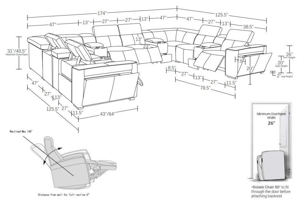 Transform your living space with the luxurious Top Grain Italian Leather U-Shaped Sectional, designed to offer the perfect combination of comfort, style, and modern convenience. This sectional features 4 power reclining seats, each with power headrests and lumbar support, ensuring that every seat provides optimal relaxation. Adjust to your ideal position with just the touch of a button, whether you"™re lounging, watching a movie, or hosting friends.Crafted from Top-Grain Italian Leather, known for its durability, rich texture, and timeless elegance, this sectional adds sophistication to any room. The solid Brazilian wood frame ensures long-lasting strength and stability, making this sectional a reliable and stylish addition to your home.Designed for convenience, the sectional includes built-in consoles that offer cup holders for easy access to your favorite beverages, storage drawers for keeping remotes, magazines, or other essentials neatly organized, and hidden storage compartments in the arms to keep your space tidy and clutter-free.Whether you''re outfitting your home theater, upgrading your living room, or creating a cozy family area, the Top Grain Italian Leather U-Shaped Sectional provides a perfect blend of luxurious comfort, modern functionality, and sleek design. It"™s the ideal choice for creating an inviting and functional space where relaxation and convenience meet.